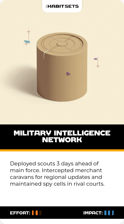 Deployed scouts 3 days ahead of main force. Intercepted merchant caravans for regional updates and maintained spy cells in rival courts.