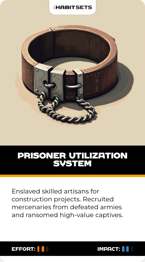 Enslaved skilled artisans for construction projects. Recruited mercenaries from defeated armies and ransomed high-value captives.