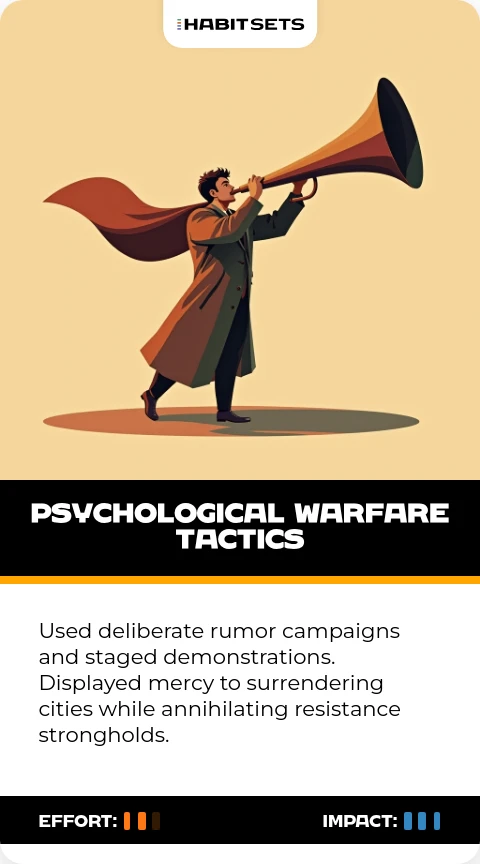 Used deliberate rumor campaigns and staged demonstrations. Displayed mercy to surrendering cities while annihilating resistance strongholds.