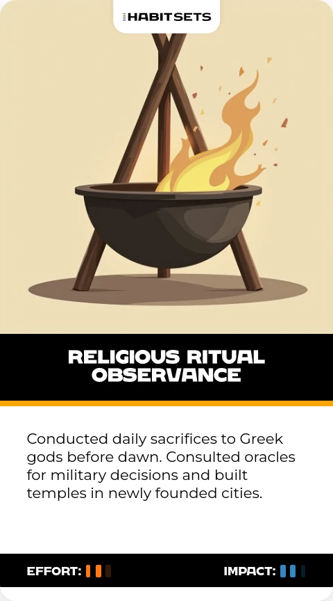 Conducted daily sacrifices to Greek gods before dawn. Consulted oracles for military decisions and built temples in newly founded cities.