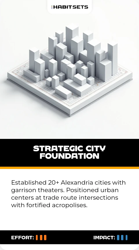 Established 20+ Alexandria cities with garrison theaters. Positioned urban centers at trade route intersections with fortified acropolises.