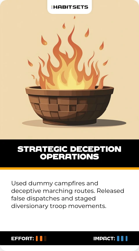Used dummy campfires and deceptive marching routes. Released false dispatches and staged diversionary troop movements.