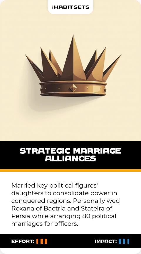 Married key political figures' daughters to consolidate power in conquered regions. Personally wed Roxana of Bactria and Stateira of Persia while arranging 80 political marriages for officers.