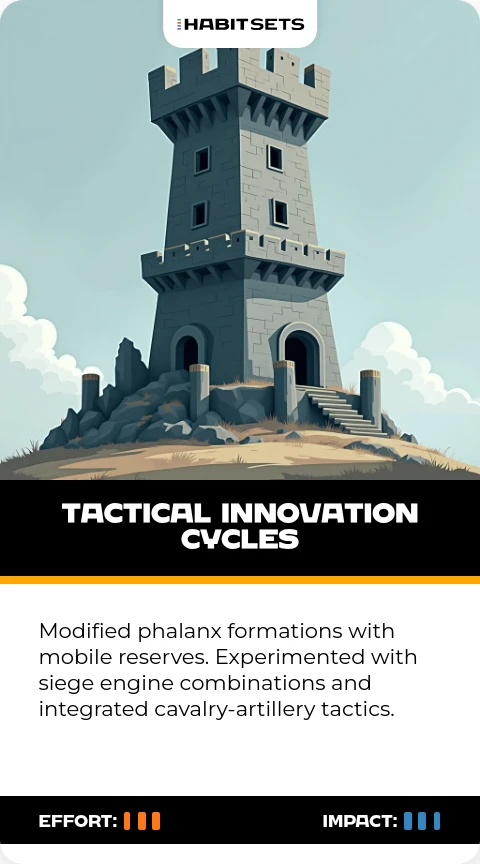 Modified phalanx formations with mobile reserves. Experimented with siege engine combinations and integrated cavalry-artillery tactics.
