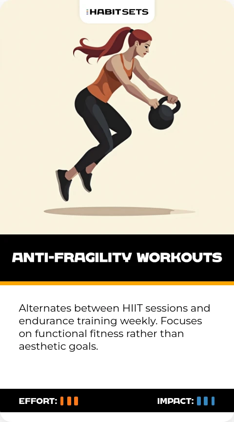 Alternates between HIIT sessions and endurance training weekly. Focuses on functional fitness rather than aesthetic goals.