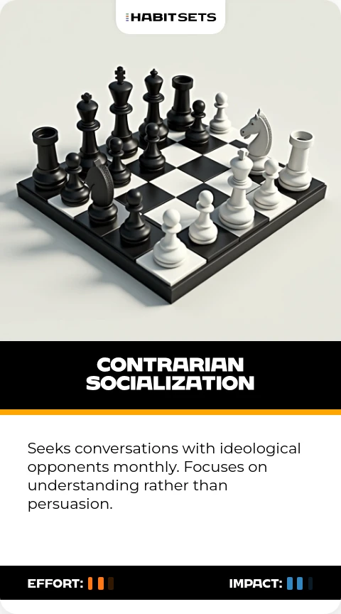 Seeks conversations with ideological opponents monthly. Focuses on understanding rather than persuasion.