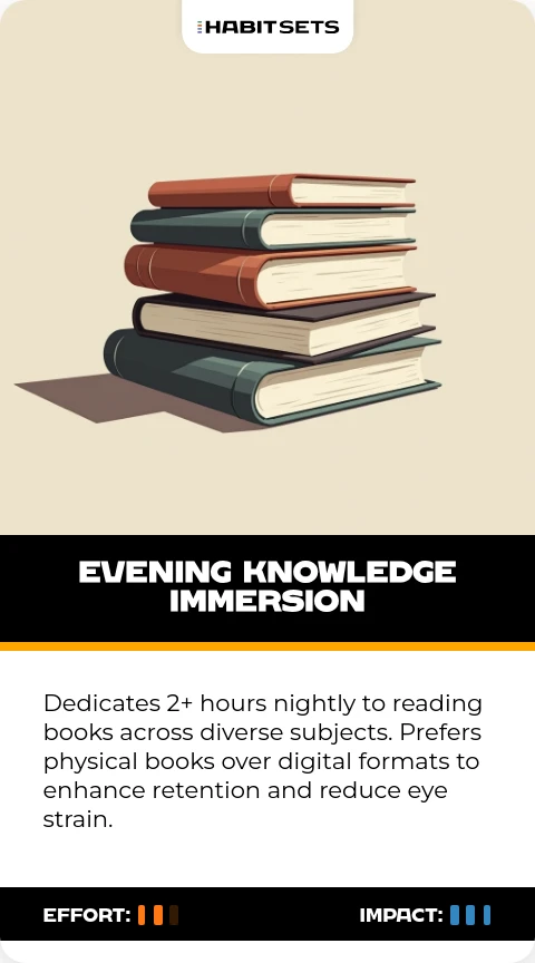 Dedicates 2+ hours nightly to reading books across diverse subjects. Prefers physical books over digital formats to enhance retention and reduce eye strain.