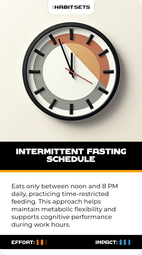 Eats only between noon and 8 PM daily, practicing time-restricted feeding. This approach helps maintain metabolic flexibility and supports cognitive performance during work hours.