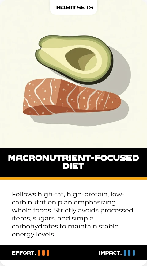 Follows high-fat, high-protein, low-carb nutrition plan emphasizing whole foods. Strictly avoids processed items, sugars, and simple carbohydrates to maintain stable energy levels.