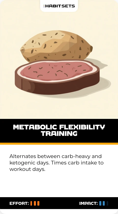Alternates between carb-heavy and ketogenic days. Times carb intake to workout days.