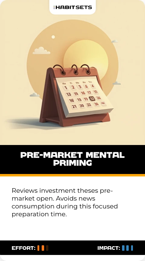 Reviews investment theses pre-market open. Avoids news consumption during this focused preparation time.