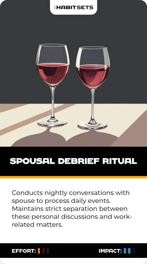 Conducts nightly conversations with spouse to process daily events. Maintains strict separation between these personal discussions and work-related matters.