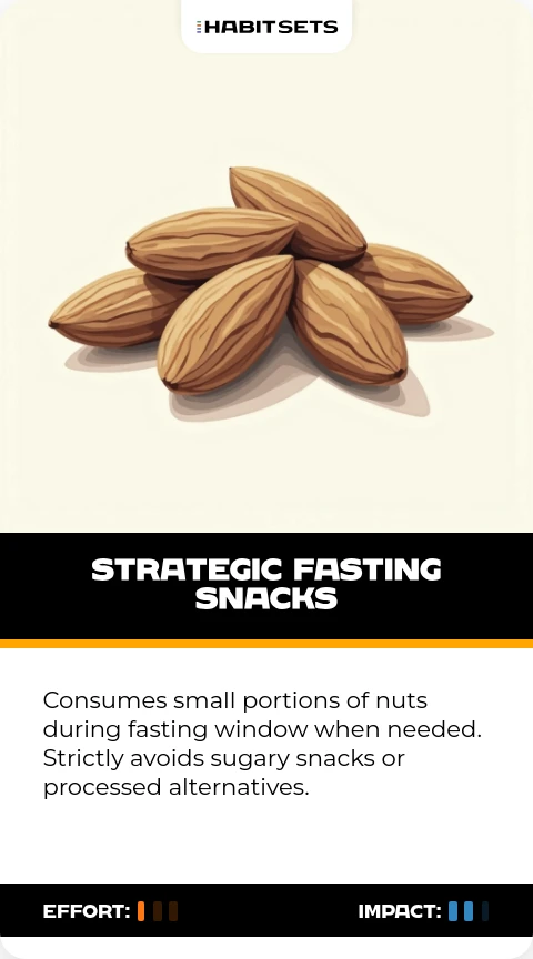 Consumes small portions of nuts during fasting window when needed. Strictly avoids sugary snacks or processed alternatives.