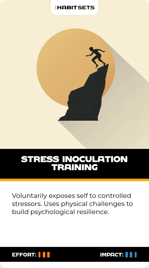 Voluntarily exposes self to controlled stressors. Uses physical challenges to build psychological resilience.