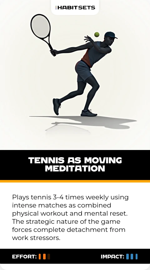 Plays tennis 3-4 times weekly using intense matches as combined physical workout and mental reset. The strategic nature of the game forces complete detachment from work stressors.