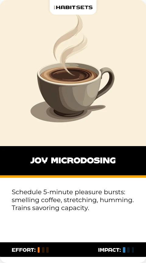 Schedule 5-minute pleasure bursts: smelling coffee, stretching, humming. Trains savoring capacity.