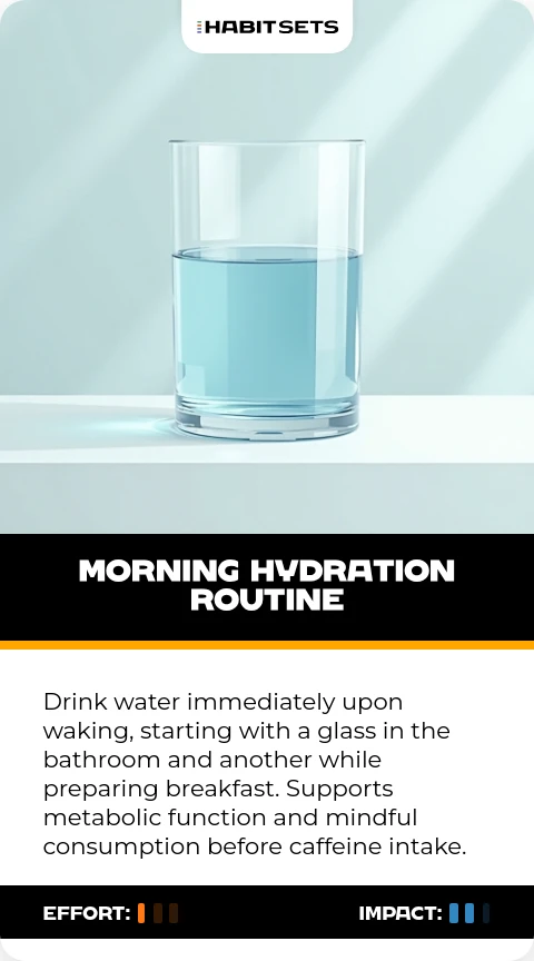 Drink water immediately upon waking, starting with a glass in the bathroom and another while preparing breakfast. Supports metabolic function and mindful consumption before caffeine intake.