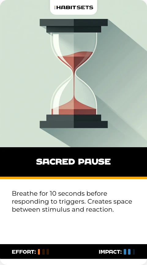 Breathe for 10 seconds before responding to triggers. Creates space between stimulus and reaction.