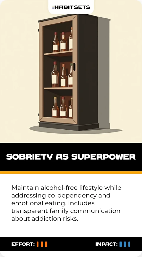 Maintain alcohol-free lifestyle while addressing co-dependency and emotional eating. Includes transparent family communication about addiction risks.