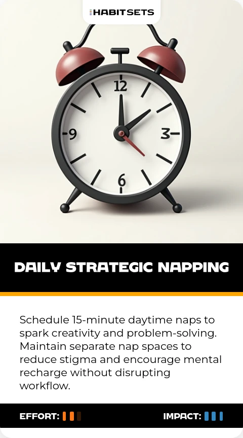 Schedule 15-minute daytime naps to spark creativity and problem-solving. Maintain separate nap spaces to reduce stigma and encourage mental recharge without disrupting workflow.