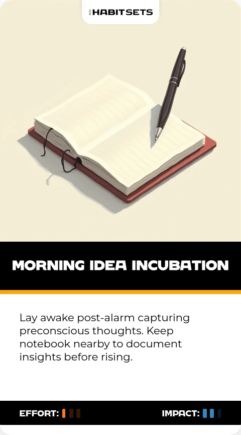 Lay awake post-alarm capturing preconscious thoughts. Keep notebook nearby to document insights before rising.