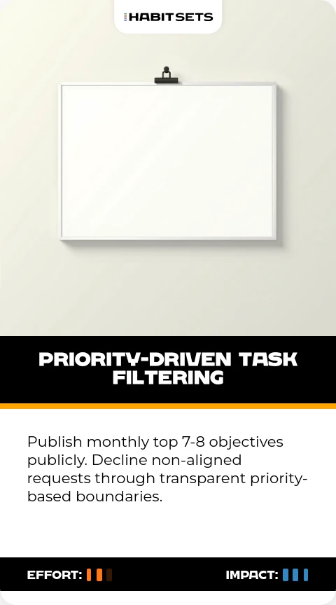 Publish monthly top 7-8 objectives publicly. Decline non-aligned requests through transparent priority-based boundaries.