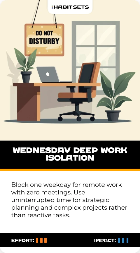 Block one weekday for remote work with zero meetings. Use uninterrupted time for strategic planning and complex projects rather than reactive tasks.