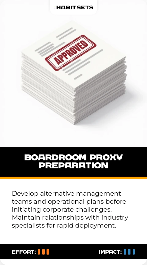Develop alternative management teams and operational plans before initiating corporate challenges. Maintain relationships with industry specialists for rapid deployment.
