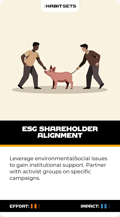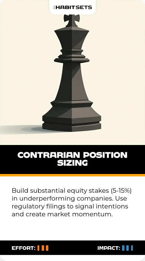 Build substantial equity stakes (5-15%) in underperforming companies. Use regulatory filings to signal intentions and create market momentum.