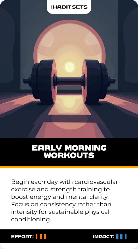 Begin each day with cardiovascular exercise and strength training to boost energy and mental clarity. Focus on consistency rather than intensity for sustainable physical conditioning.