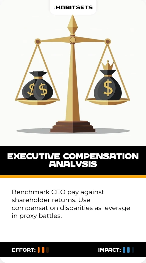 Benchmark CEO pay against shareholder returns. Use compensation disparities as leverage in proxy battles.