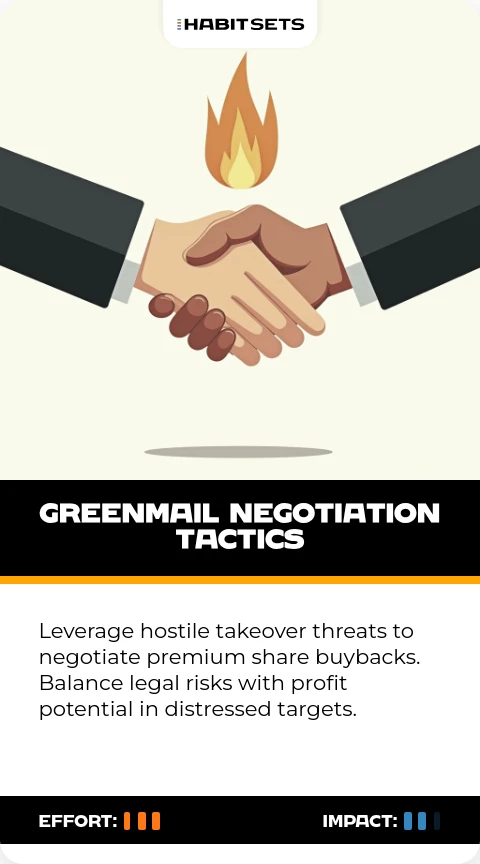 Leverage hostile takeover threats to negotiate premium share buybacks. Balance legal risks with profit potential in distressed targets.