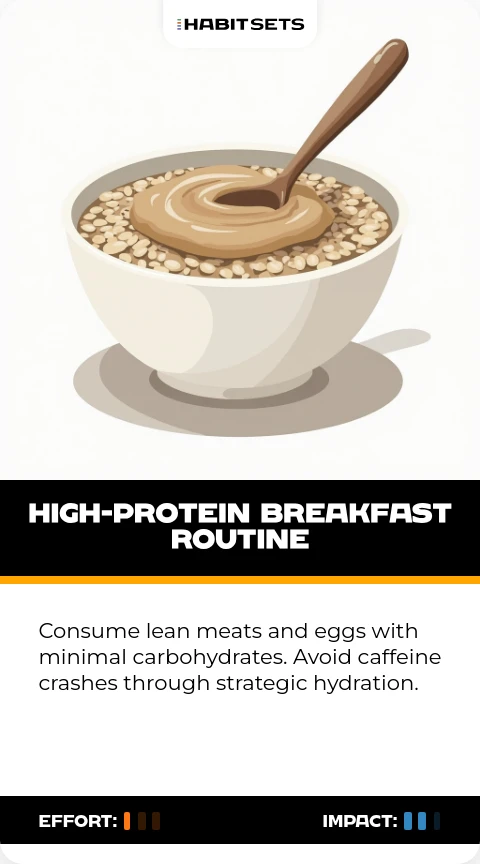 Consume lean meats and eggs with minimal carbohydrates. Avoid caffeine crashes through strategic hydration.
