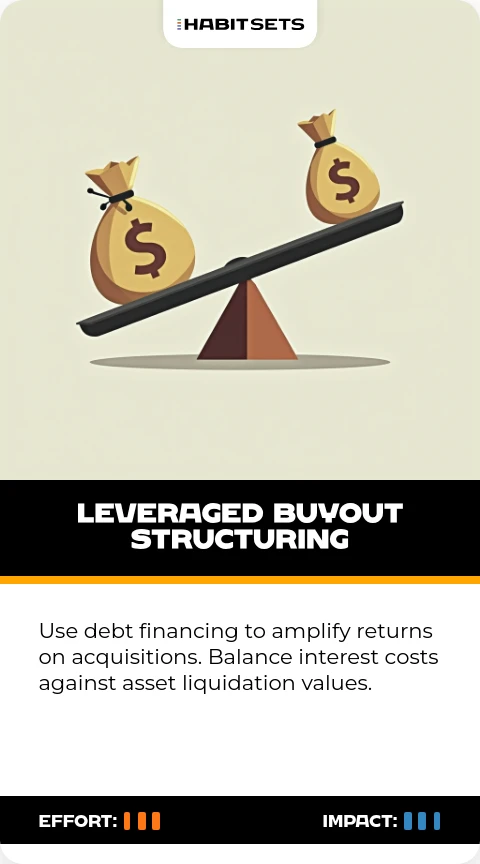 Use debt financing to amplify returns on acquisitions. Balance interest costs against asset liquidation values.