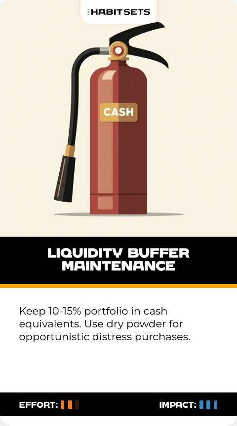 Keep 10-15% portfolio in cash equivalents. Use dry powder for opportunistic distress purchases.