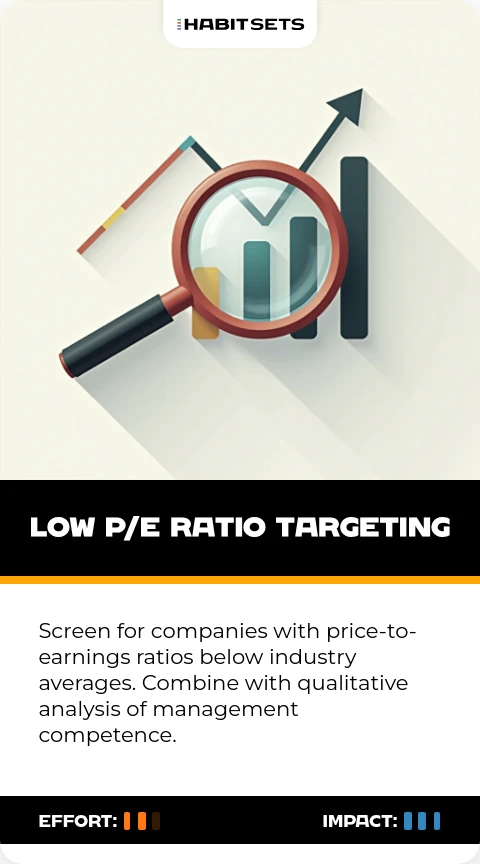 Screen for companies with price-to-earnings ratios below industry averages. Combine with qualitative analysis of management competence.