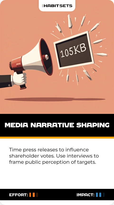 Time press releases to influence shareholder votes. Use interviews to frame public perception of targets.