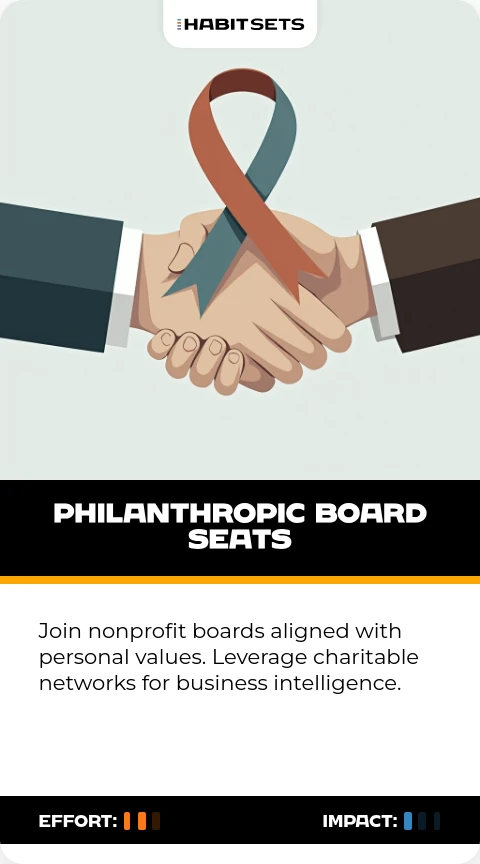 Join nonprofit boards aligned with personal values. Leverage charitable networks for business intelligence.