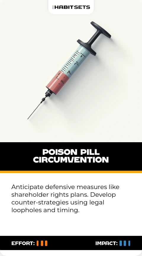 Anticipate defensive measures like shareholder rights plans. Develop counter-strategies using legal loopholes and timing.