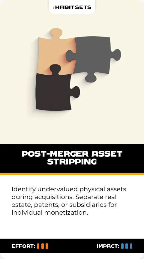 Identify undervalued physical assets during acquisitions. Separate real estate, patents, or subsidiaries for individual monetization.