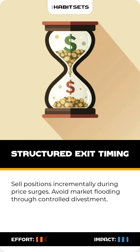 Sell positions incrementally during price surges. Avoid market flooding through controlled divestment.