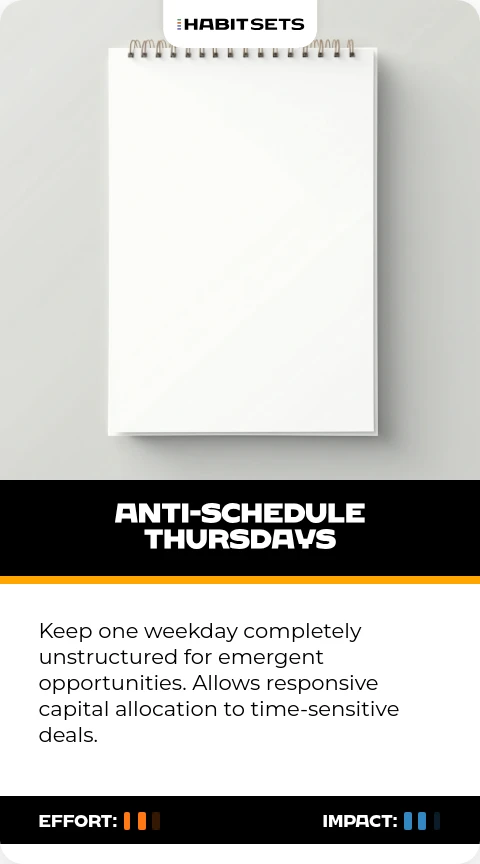 Keep one weekday completely unstructured for emergent opportunities. Allows responsive capital allocation to time-sensitive deals.
