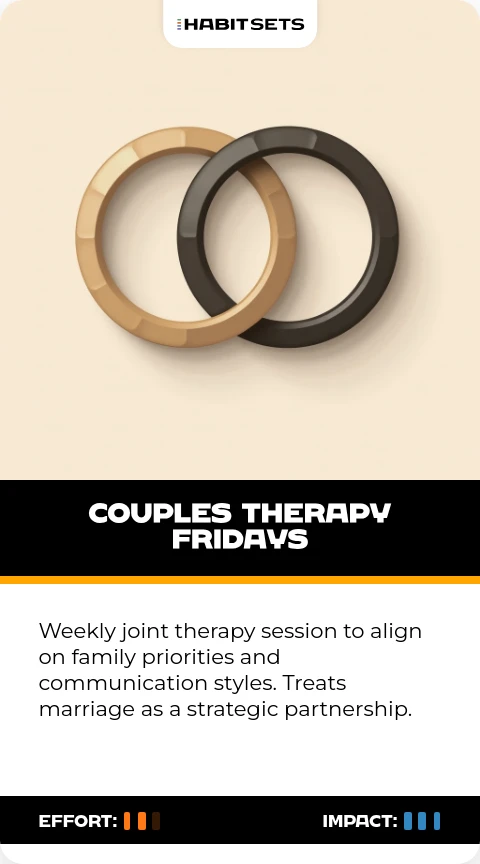 Weekly joint therapy session to align on family priorities and communication styles. Treats marriage as a strategic partnership.