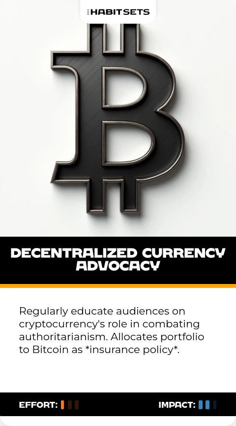 Regularly educate audiences on cryptocurrency's role in combating authoritarianism. Allocates portfolio to Bitcoin as *insurance policy*.