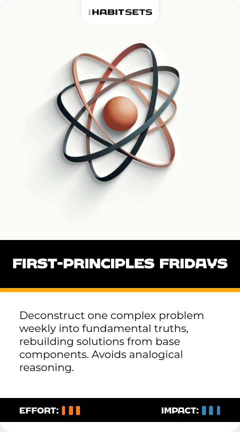 Deconstruct one complex problem weekly into fundamental truths, rebuilding solutions from base components. Avoids analogical reasoning.