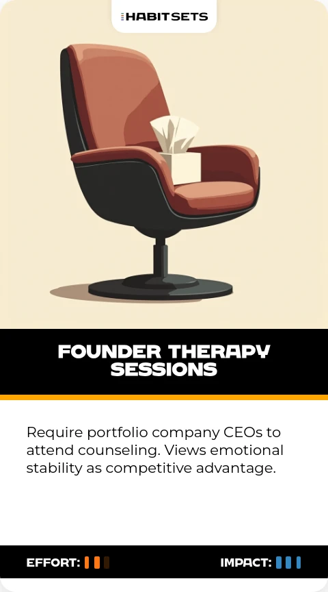 Require portfolio company CEOs to attend counseling. Views emotional stability as competitive advantage.