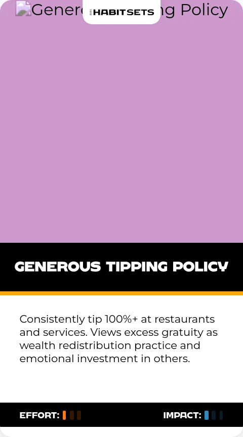 Consistently tip 100%+ at restaurants and services. Views excess gratuity as wealth redistribution practice and emotional investment in others.
