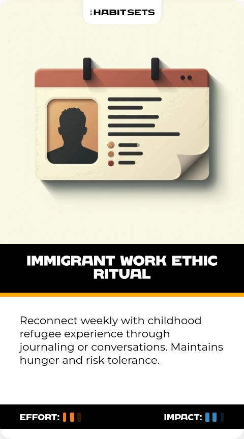 Reconnect weekly with childhood refugee experience through journaling or conversations. Maintains hunger and risk tolerance.