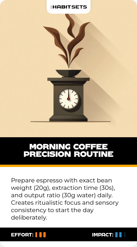 Prepare espresso with exact bean weight (20g), extraction time (30s), and output ratio (30g water) daily. Creates ritualistic focus and sensory consistency to start the day deliberately.