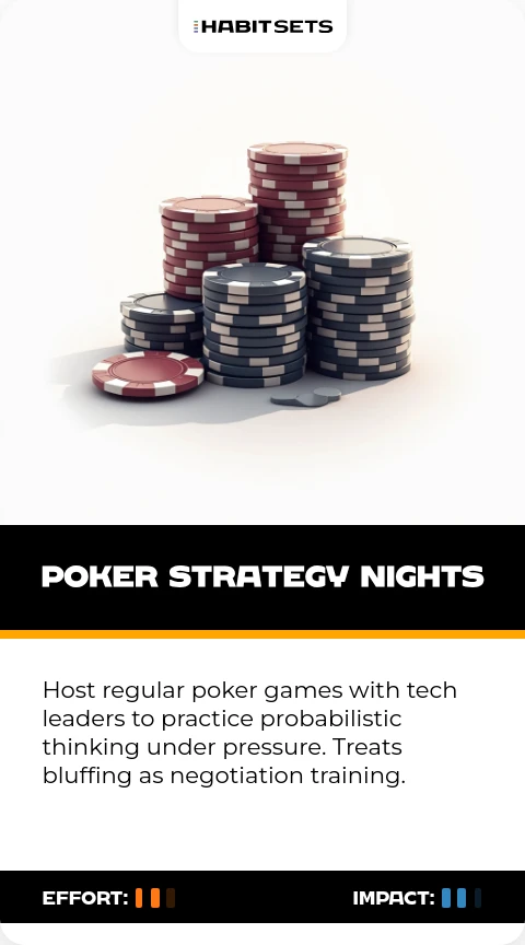 Host regular poker games with tech leaders to practice probabilistic thinking under pressure. Treats bluffing as negotiation training.